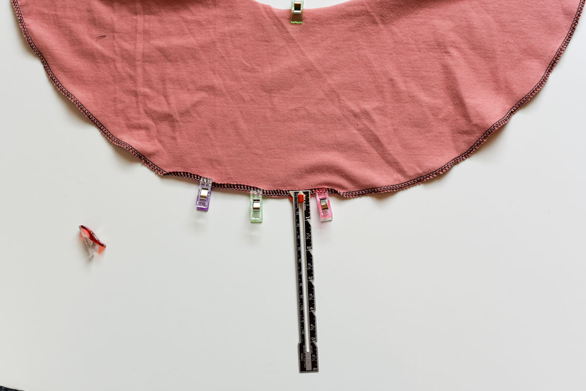 Turn up your hem 1/4″ and pin or clip. If you use wonder tape, you will not have to pin as much because wonder tape is sticky on both sides and it will hold just as well as a clip or pin.