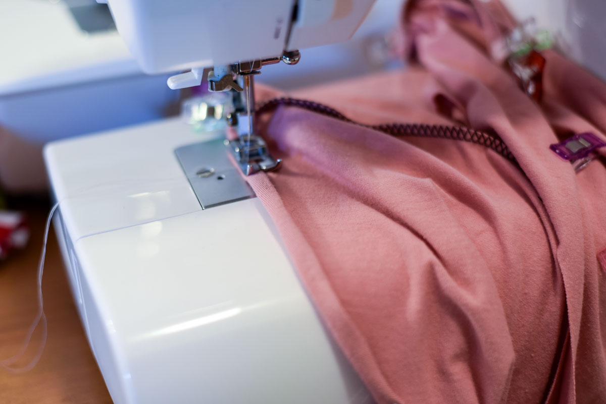 Hem your rolled hem about 1/8″ away from the top edge, being sure to keep your hem rolled nicely as you sew. I use a longer straight stitch when sewing bottom hems since these will not need to be stretched very often. Now remember that since the original hem was supposed to be 1″, using this method will create a hemline that is 0.5″ longer so keep that in mind.