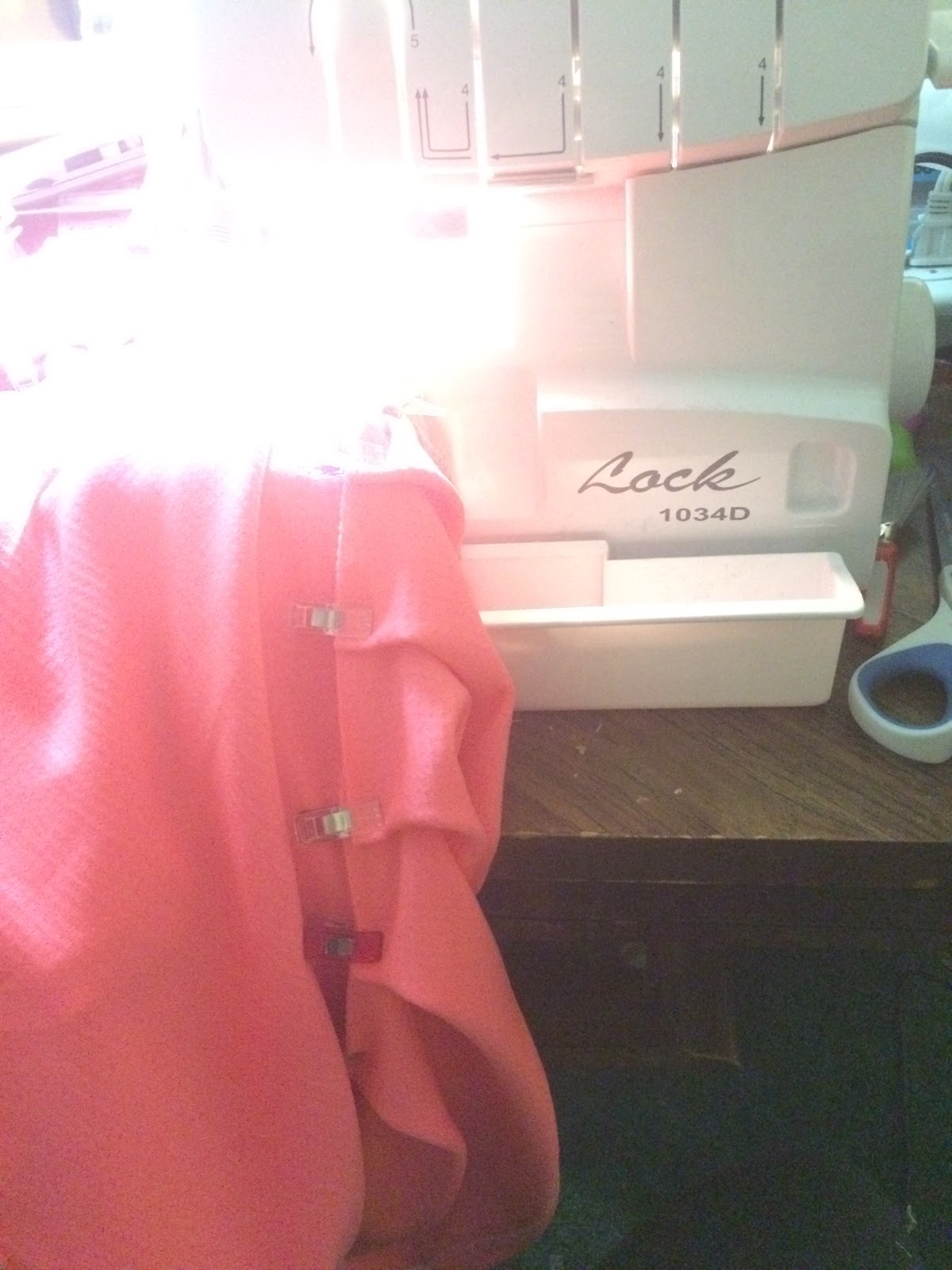 As you sew this seam, you’ll be catching the folded fabric to make your pleats. Be sure that when you folded, you didn’t fold at an angle. Pleats should be straight at the waist. I find it easier when I do the pleats all folded the same direction so that I can serge with the fold and help prevent pleats from slipping out of the seam while I’m serging.