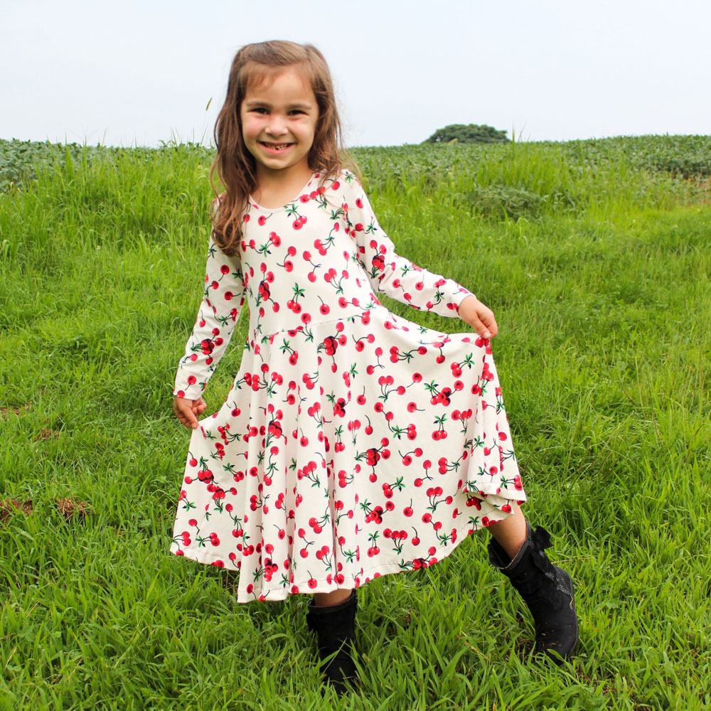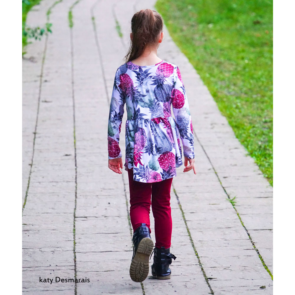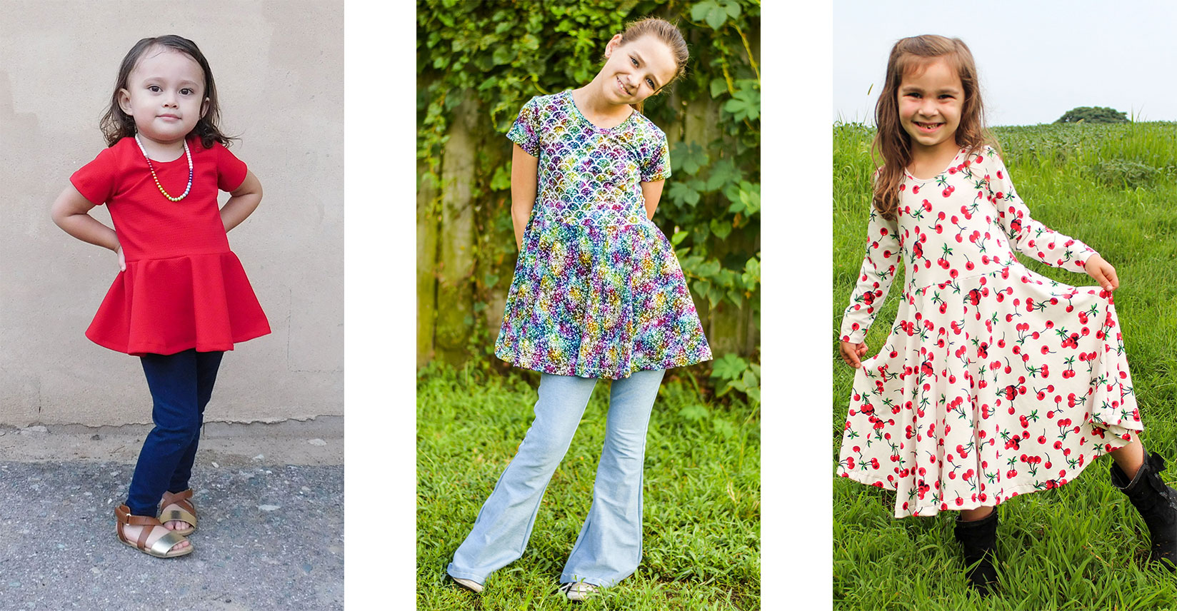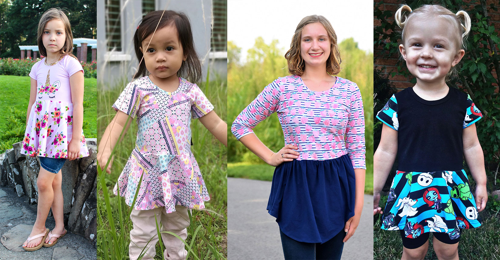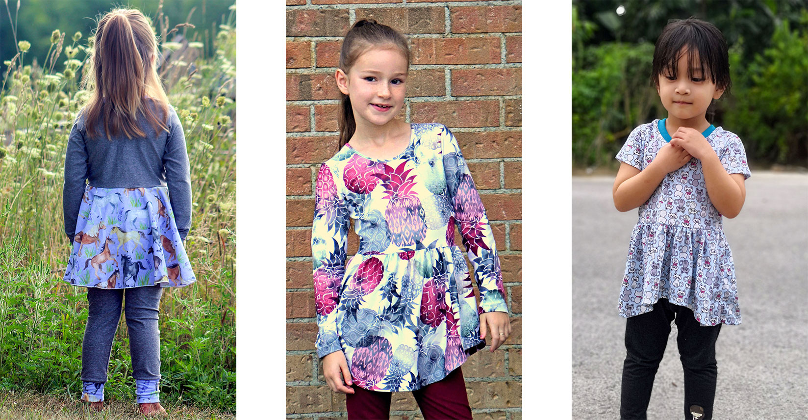 There are a couple different peplum options for the girl’s pattern. On the left in the picture above is the full circle peplum in tunic length. Circle peplums have an amazing twirl factor that your little girls and even older little ladies will love! In the middle is pictured the gathered curved hem peplum which is lower in the front and back and curves up at the sides. On the right is the gathered high/low peplum which is longer in the back and higher in the front. The high/low and curve hem are only options for the gathered peplum. With each option you get a totally different look!