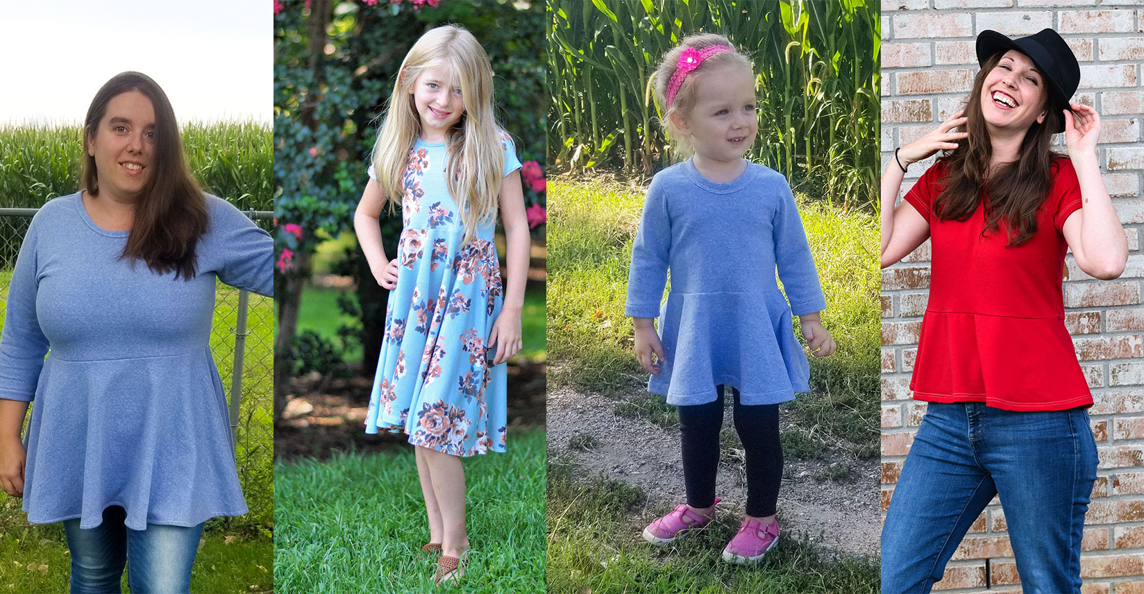 The women’s pattern has one more peplum option than the girl’s version. There is a gathered high low featured in the picture to the far left which also has a double skirt half circle peplum on top. The picture to the center left shows a gorgeous version of the gathered curve hem tunic style and the picture to the center right pictures a full circle top peplum. The picture on the right shows a half circle peplum top length. The half circle peplum was added in later during testing because the ladies thought that it was a very flattering way to slim the hips and accentuate the waist and I am so happy with the results. I think it looks stunning on all of these ladies!
