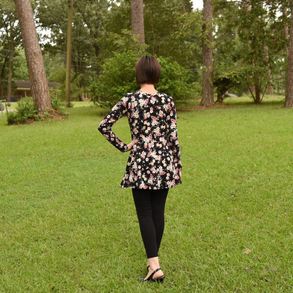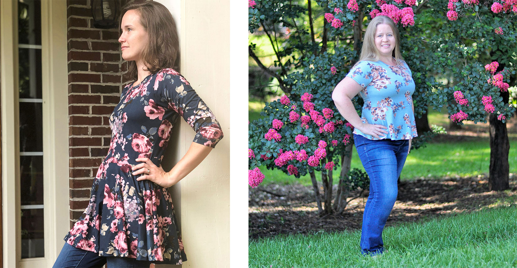 There are two different length options in the women’s pattern and three different sleeve options (long, 3/4 sleeve, and short sleeves). The tunic on the left is a full circle peplum while the top on the right is a half circle peplum.