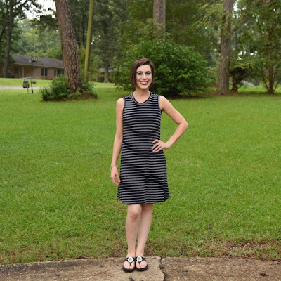 My title suggests that my dress was $5, so let me tell you about that! I was at Wal-Mart recently. I don’t typically purchase knit fabrics from Wal-Mart, but I was browsing through and saw this one. It was something close to $3.50/ yard. The fabric content wasn’t labeled, but it’s soft… like maybe a rayon/poly/spandex blend or something? Well… with this pattern in mind, I bought the fabric. I went ahead and purchased one and a half yards, just to be safe, but I had some leftovers. The pattern for my size says it needs 1 yard, but I wanted to be sure I would have enough! I already had thread on hand, but even had I needed to purchase a spool of thread, I probably still would have come out close to $5 if I had only purchased the 1 yard the pattern requires!