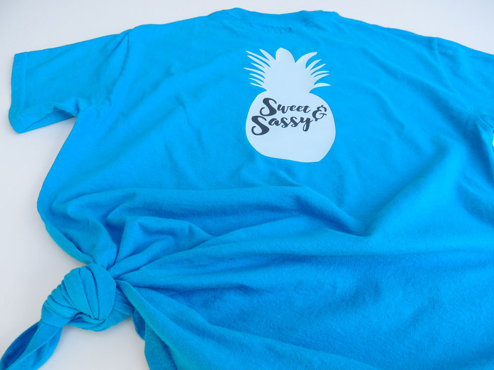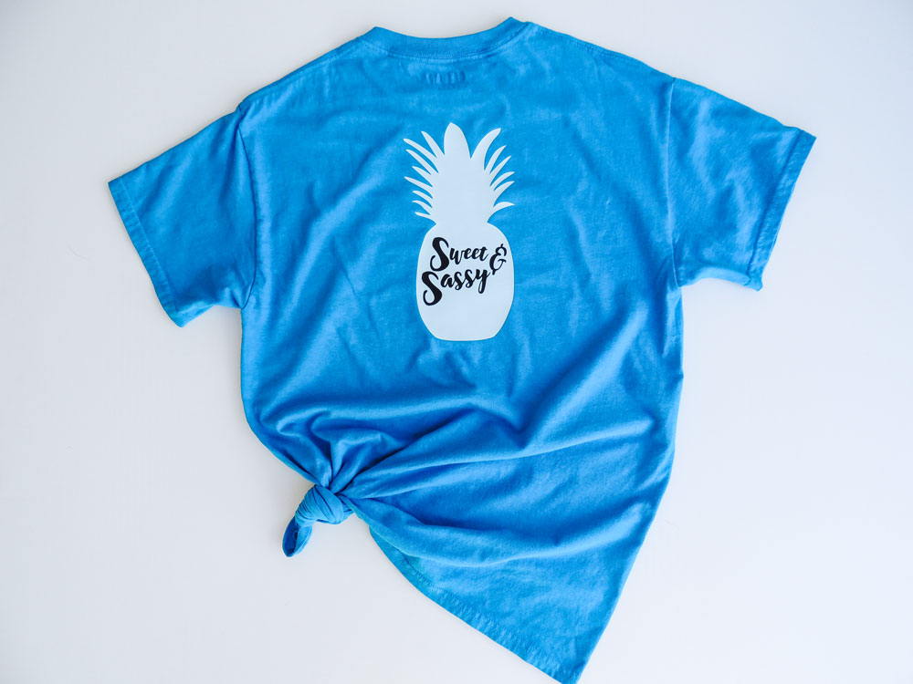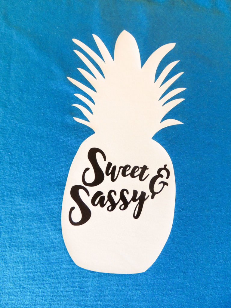 Choose and cut your design. I chose this Sweet & Sassy design to make a birthday gift for my sister. You will also want to wash your t-shirt to make sure that the shirt does not shrink and warp the vinyl. You do not want to use fabric softener. This messes with the bondage of the vinyl to the t-shirt. There are some that swear by not washing, but I prefer not to take that chance.