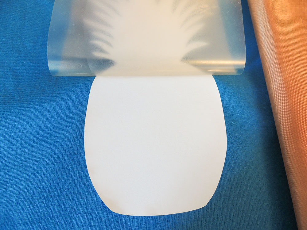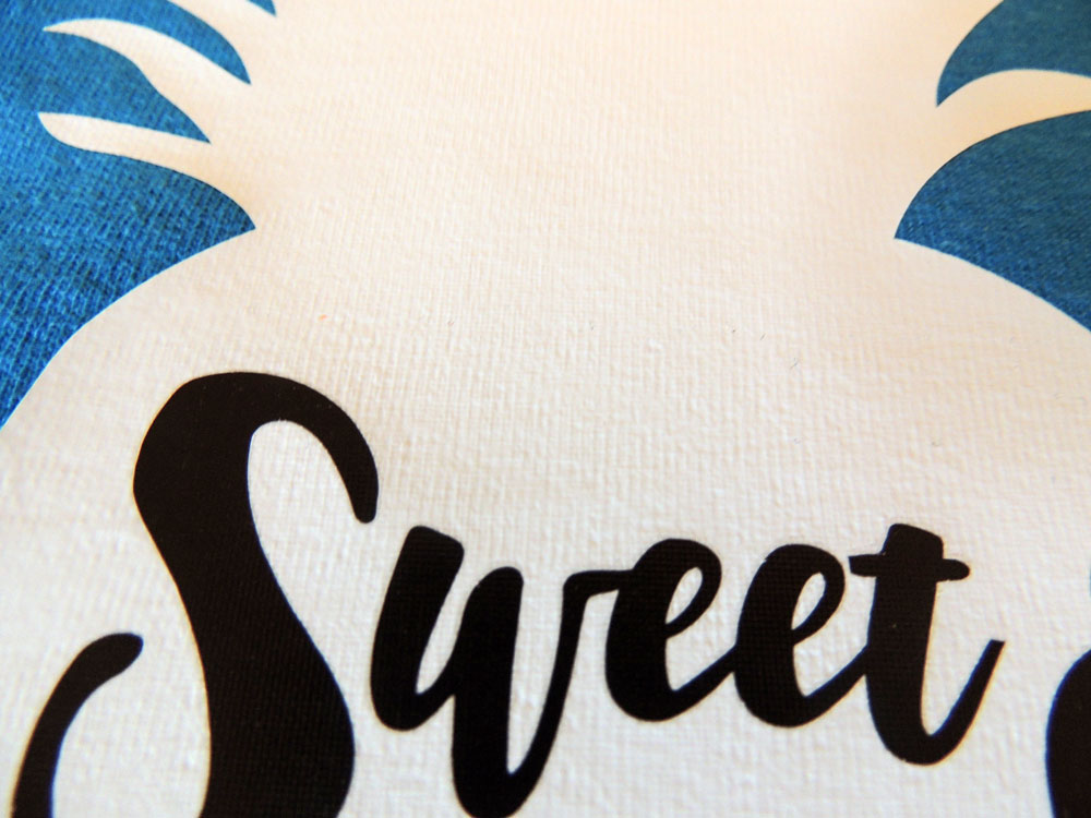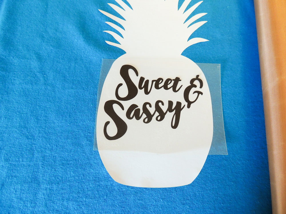 Place your design onto your shirt sticky side down. The shinny clear carrier sheet will be on top. Lightly press the design onto your shirt with your hand. If your design has words, it will read correctly. Since this design is layered I will place my bottom layer first onto my shirt. In this case, it is the pineapple shape.